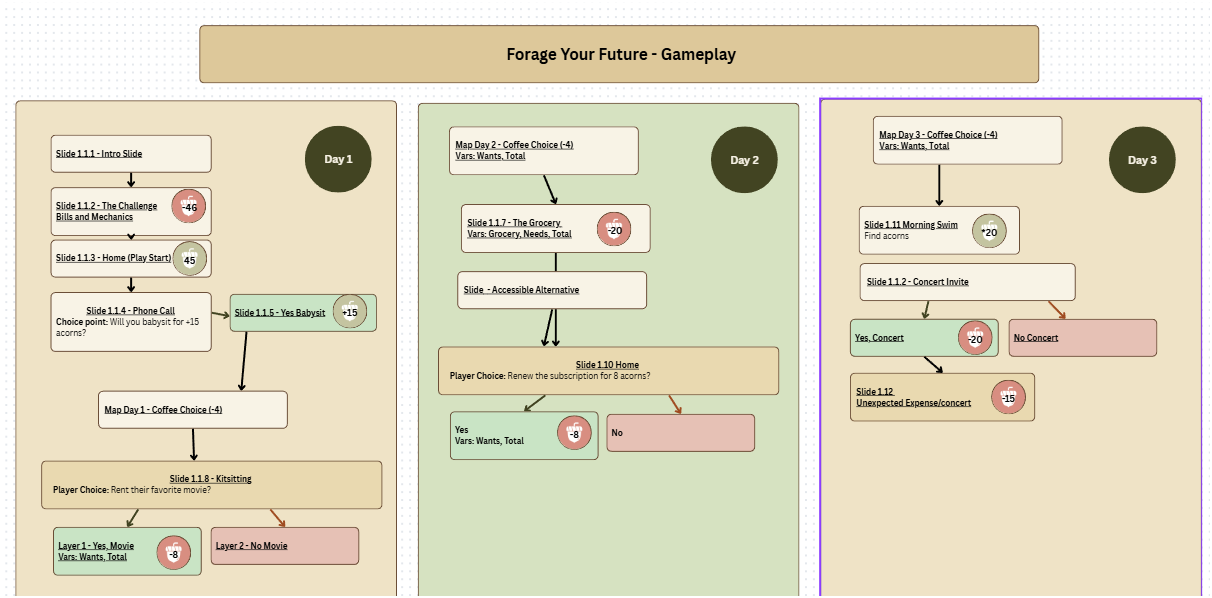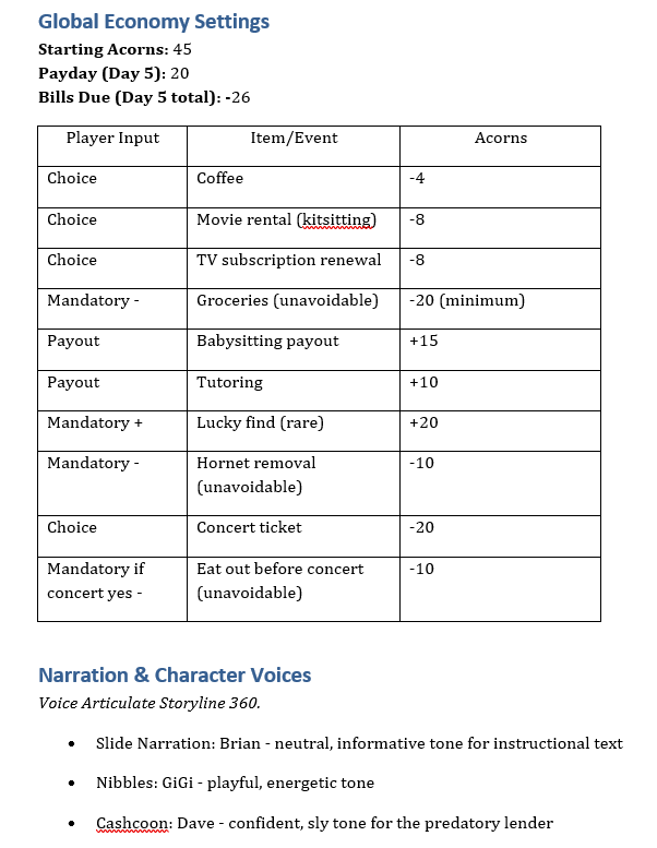 With more time, I would like to rebuild this concept in a dedicated game or simulation engine. This would allow for more nuanced learner choices, a more dynamic and authentic economy system, and adaptive difficulty that mirrors the unpredictable financial decisions learners face in the real world.