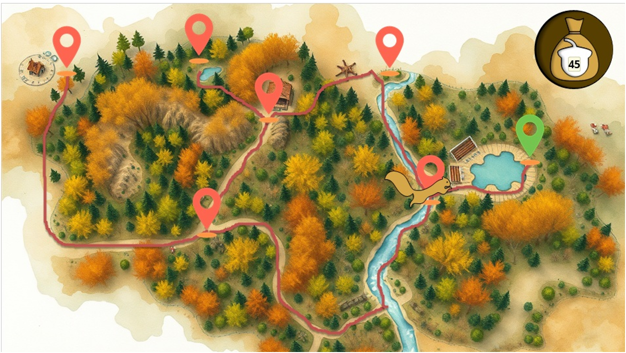 Forage Your Future reframes budgeting as a story. Learners help Nibbles, a cute squirrel, decide how to spend a limited stash of acorns across housing, food, fun, and savings while still making it through the week.